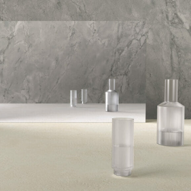 Marbrures surdimensionnées et veinage intense dans une esthétique organique de nuances gris poussière formant des amas, entourés de zones plus blanches, dans un ton neutre audacieux inspiré de la nature et adouci par des nuances subtiles ponctuées de reflets blancs, avec une finition Ultra-Rugueuse.