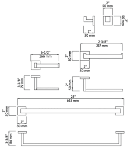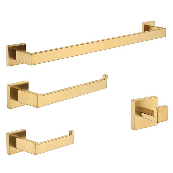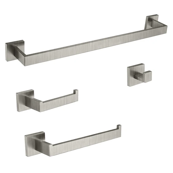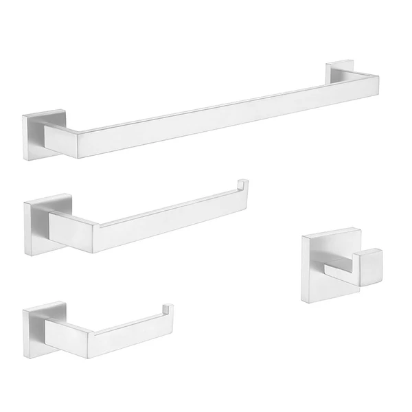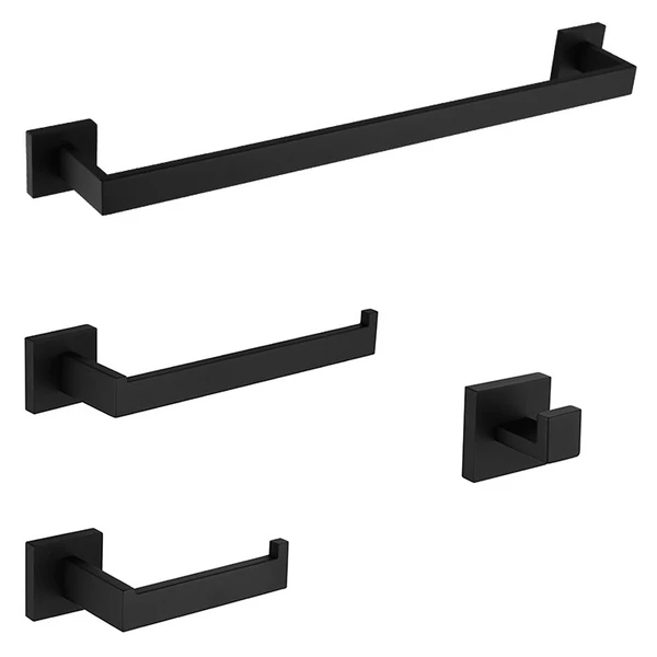 4 pièces : porte-serviette de bain (25’’), porte-serviette à main, porte-papier hygiénique et crochet