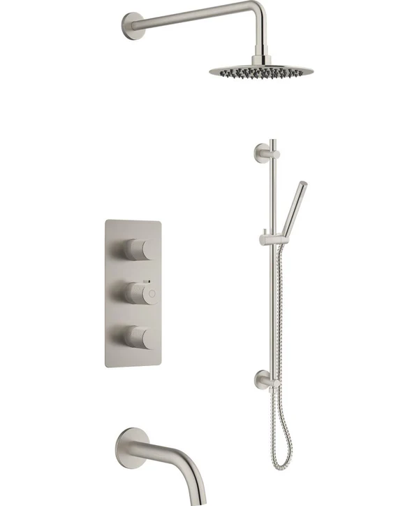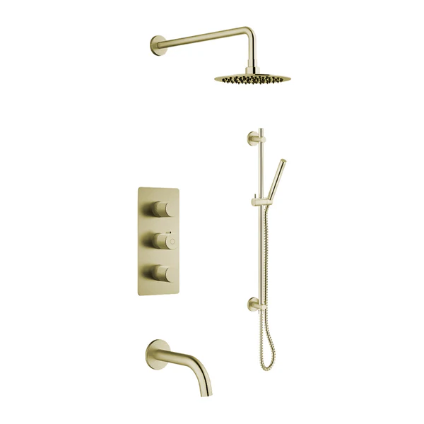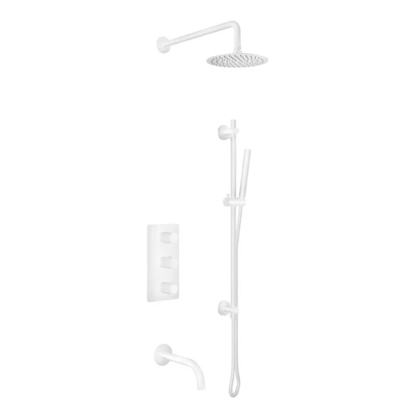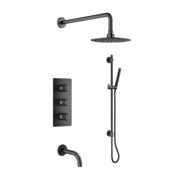Complétez votre salle de bain avec cette robinetterie bain-douche à 3 fonctions. Cet ensemble comprend une douche à effet pluie, une douchette à main avec barre, un bec de baignoire, une valve thermostatique et un déviateur. La cartouche en céramique et le corps en laiton massif assurent une durabilité optimale. Le modèle VEDA est idéal pour une salle de bain au style moderne.